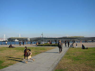 | 向こうに見える平べったいのが 横浜大桟橋国際客船ターミナル。 12月1日にグランドオープン。 眺めがよく、横浜の新名所です。 |