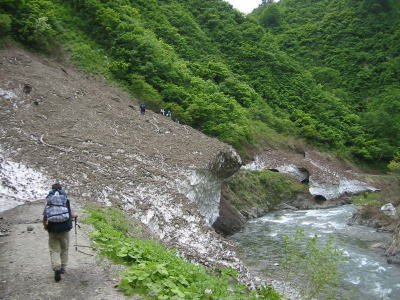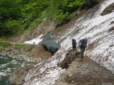 | 釣り上がる我々の行く手を阻む雪渓。 これが崩れてきたらインディー・ジョーンズの世界だなあ。 その時はBOSSさんを置いて逃げよう。 |