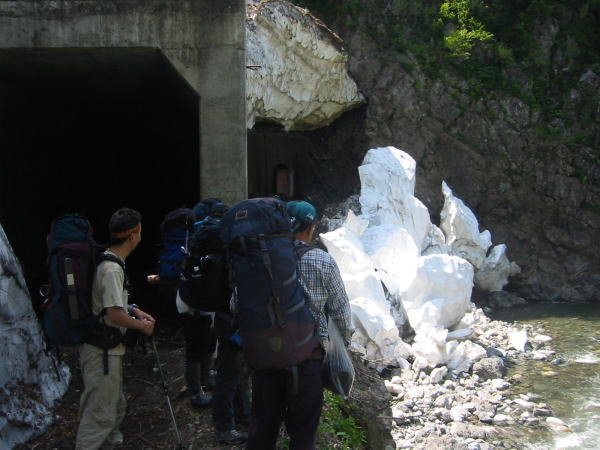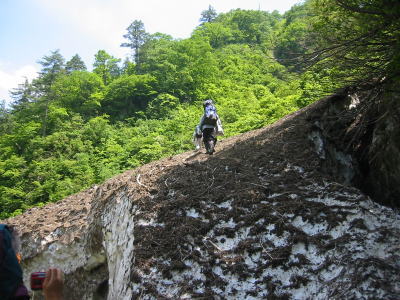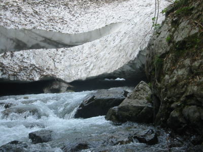 今回のツアーで、私にとって衝撃度ナンバー1は林道に覆いかぶさる雪渓でした。