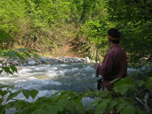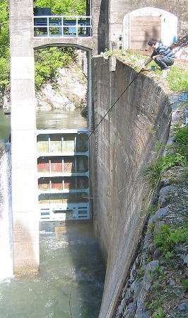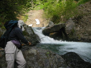 大きな落ち込みの脇を狙う三井さん。残念ながら反応なし。