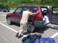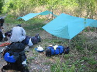 テン場に到着し(といっても林道の脇)、三井さんが立ち木を利用してシートで屋根を作ります。