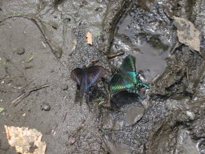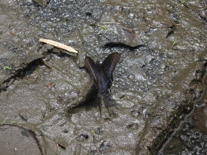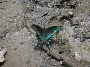 テン場の近くにいたチョウ。 金属光沢のあるきれいな羽でした。 なんていうチョウでしょうね? 熱心に水を飲んでいたので、 沢の水を少しまいてあげました。 |