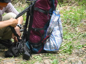 ザックをパンパンにした上、トートバックも満タンにしてザックにくくりつけてました。