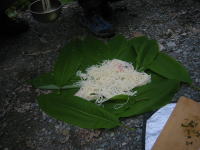 ゆであがったそうめんは地面の上の葉っぱに盛られました。
