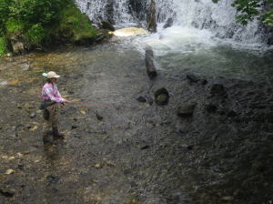 湯川では大勢の人がフライフィッシングで釣りをしていた。