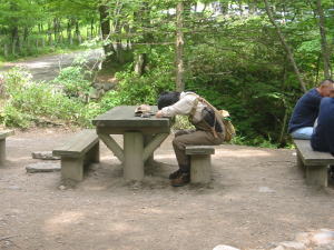 赤沼茶屋の駐車場はいっぱい。結局、湯滝の有料駐車場に車を止めて遊歩道を歩いて行く。