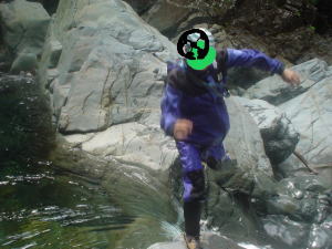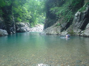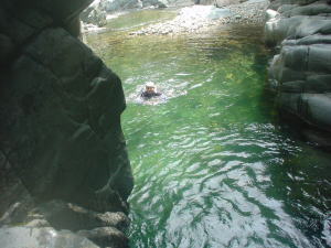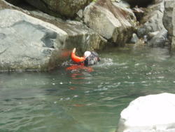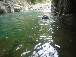 沢に入ってしばらくすると大きな渕。ここで沢での泳ぎを初体験する。