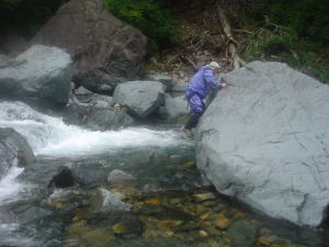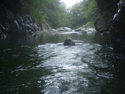 へつったり、泳いだりしながら上流へ進む。雨具を着ているので泳いでも少し寒い程度。歩いていれば問題ない。