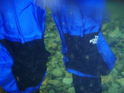雨具を着ているので泳ぐといろいろなところに水がたまる。