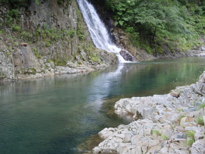 何気なく今泳いできたゴルュジュを見ると、下流側に3人の釣り人の姿が見える。どうやら高巻きはできなかったようだ(今まであったトラロープがなくなっていたとのこと)。