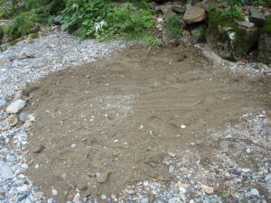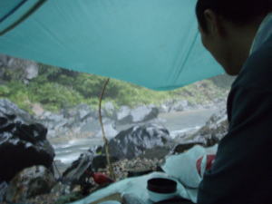 ふと後ろを見ると山側から水が流れてくる!三井さんが合羽を着て溝を掘り始めた。私は雨でつぶれないようにタープを持ち上げる。