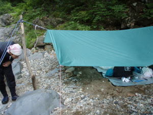 少し早いがテン場を決めてタープを張る。今日はここを拠点に上まで行ってみようという算段である。