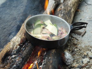 夕食を食べ始めてしばらくすると雨が降り出した。焚き火のそばを離れてタープの下に引越し。そこで三井さんが作ったジャガイモなどをつついていたが、いきなり雨脚が強くなった。