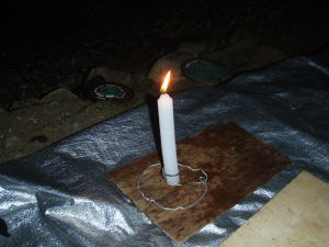 雨具を着てタープの下で真っ暗になる。日が落ちてあたりもどんどん暗くなる。