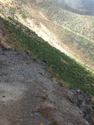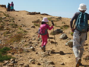 火山だからなのか石やら砂やらが多く歩きにくい。気をつけるが滑ってしまう。滑るとフットサルで痛めた膝が痛い。