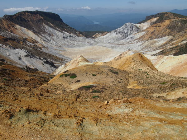沼ノ平という立ち入り禁止区域だ。硫黄のにおいがする。遠くに見えるのは秋元湖だろう。