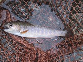 カディスのパターンを流して、他に気を取られた瞬間にライズ音。すかさずあわせるとヒット。うーんよく引きますね。釣れたのはきれいなブルックトラウト。湯川は「河原」がないので写真を取るのに苦労します。