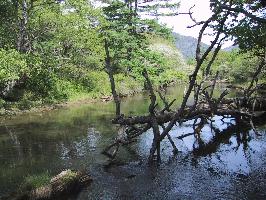 さて、だいぶ遅くなってので、裏磐梯での釣りをやめ、喜多方市を流れる熱塩川の支流、野辺沢川に釣りに行くことにしました。 熱塩川でも野辺沢川でも今までろくな目に会っていません。増水だったりいきなり暑かったり。 今回はどうかな? クマの剥製が置いてある農家で釣り券購入。以前聞いたところ、このクマはここのご主人が獲ったものだそうです。おととしは「クマ出没注意」の看板があちこちに出ていました。 少し下に戻って、堰堤の上からスタート。すぐに落ち込みで反応があります。何回か流してみると岩魚が釣れました。腹が減ってたんだね。 フライは適当に結んだ茶色のパラダンでした。 しかしその後は1匹追加しただけで終わり。魚影が薄いかな?今度はもっと下流でやってみます。 |