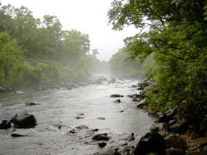 入渓点は昨日と同じ橋の下流です。時々雨が強く降ったりやんだりと忙しい天気です。降っているときは休み、やむと進みます。出るのは小さなヤマメばかりですが、反応は昨日よりはいいようです。しかし最後まで釣れず、朝食の時間となりました。