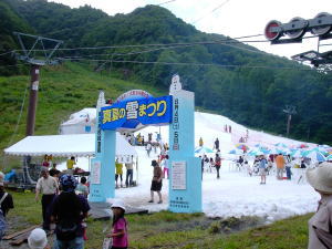 スキー場の一部に人工雪を敷きつめ、そこでミニジャンプのコンテストのようなことをやっていました。下のほうでは雪上にパラソルテーブルが置いてあり、焼きそばや串焼きを食べている人がいます。さらにはその横にステージがあり、なんとハワイアンダンスショーをやっていました。プログラムを見ると、この後、サンショウウオレース(なんだ?)、岩魚のつかみ取り(雪の上でやるのか?)と続き、夜には歌謡ショー、花火大会があるようです。テレビ局も取材に来ていました。