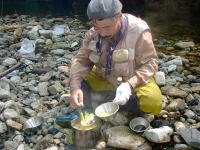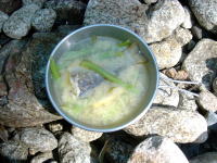 お昼は川で火を起こし、岩魚の味噌汁をご馳走になりました。岩魚のだしがきいて非常においしいものでした。
