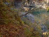 | ヤマメクラシックUは本当に自然渓流。けっこう釣りにくいところもあります。 一番右の写真は堰堤の巻き道に張られたロープです(上から見たところ)。 ここを登ってくるときに足を滑らせ、死ぬかと思いました。 |