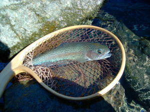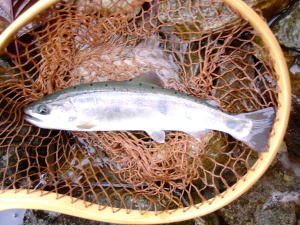 コンクリートブロックの影に魚影発見!フローティングニンフを流してみると、釣れたのはニジマス。ヤマメクラシックじゃないのか?