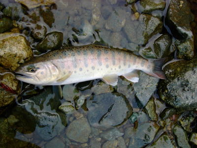 12時に昼食ということにして釣り開始。ライズも少しあります。ミッジのドライフライを投げてみると数投で岩魚がヒット。
