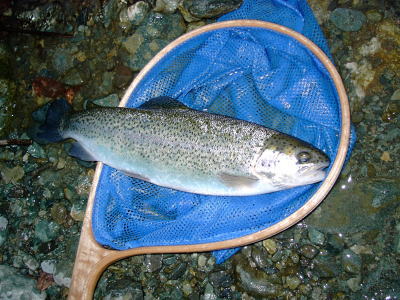 | みんなには秘密ですが、実は私、調子に乗ってお酒を飲みすぎてしまい、酔ってしまいました。 フロータントは落とすわまちがってフライボックスは投げてしまうわ。 よく水に落ちなかったものです。 左はZINさん推薦のオレンジパートリッジに来たヤマメ。 右は夕方になってニンフで釣れたでかニジマス。 いずれも吻の先にフライがかかっていました。 ばれますよね。 |