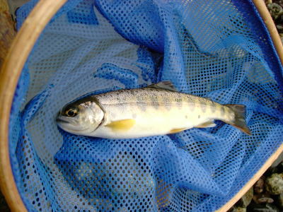 しかし間抜けなやつもいるようでヒット。取り込んでみると小さなヤマメ。やっと釣れました。
