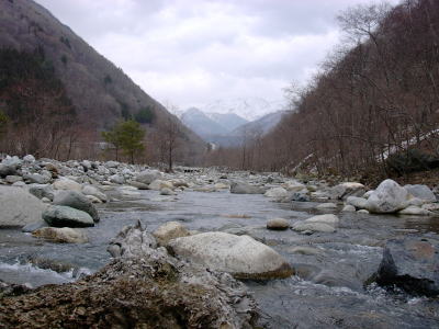 あきらめて上流に向かいます。蒲田川は温泉と地熱の関係で上流のほうが水温が高いという変な川です。