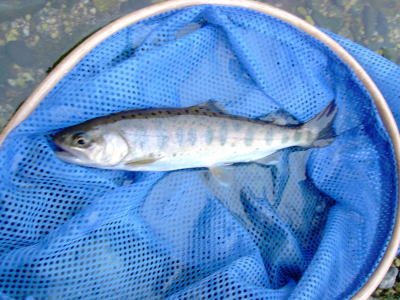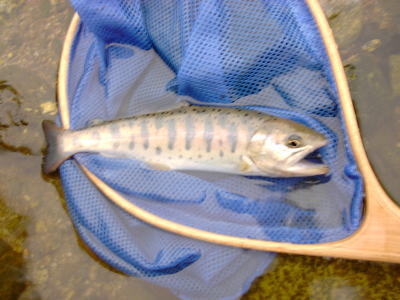 小さなヤマメですが、まずは道志の第1号。やりましたねー。