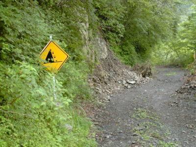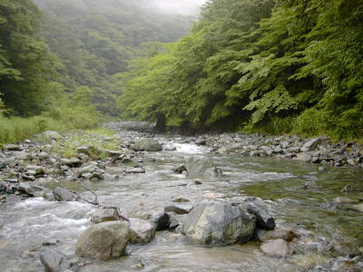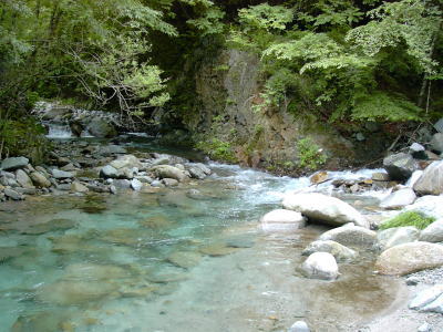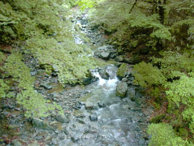 流れ込んでいる所を「浅瀬」といいますが、上流へ向かう林道にはここでゲートが設置されており、車両の進入を禁止、