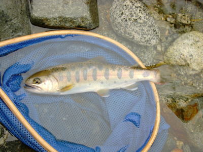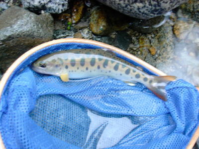 しばらく釣り上がっていくとまあまあのサイズがヒット。きれいなヤマメです。水深のある淵の流芯にいました。