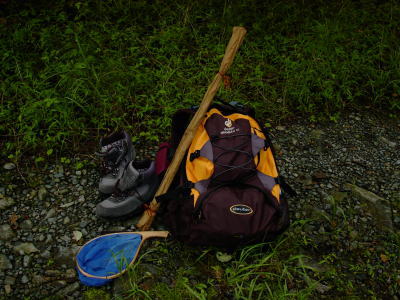 ザックからウエーダーとウエーディングシューズを出して着替えます。