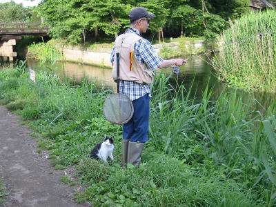 釣りの途中でネコをお供に釣っている人を見かけました。おお、フライフィッシング犬ならぬフライフィッシングネコか。