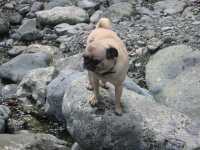 | 釣りのお供をするパグ。 名前は「はな」 やつは水が恐いのだ。 |