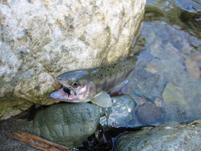 ニンフで釣れたヤマメ。 少し深い所で釣れました。 |