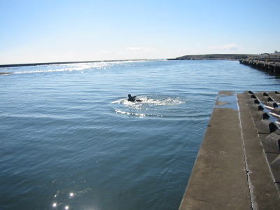 河口を目指し、岸から突如泳ぎだすサーファー。 なるほど、ここからエントリーしてるんですね。 |