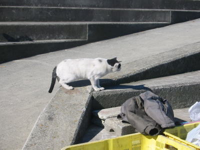 | 漁港につきもののネコ。 視線の先には釣り人が捨てたゴカイをついばむ鳩の群れが。 |