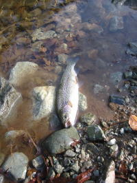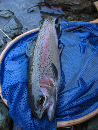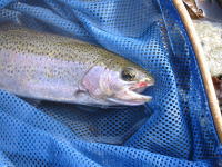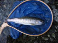 それでもフライを替えて投げていると、フローティングニンフにニジマスがヒット。