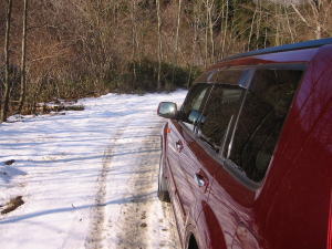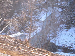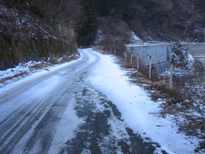 しばらく行くと林道は雪で凍っています。BOSSさんがこんなに丹沢に雪が多いのは珍しいと言います。