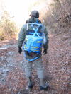 ウェーダーを履き、ザックにポリタンクをつめて担ぎます。