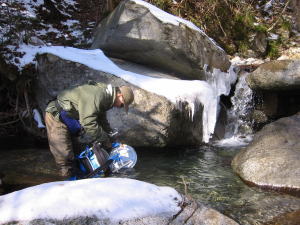 沢を決めると、持って来たポリタンクに稚魚を入れてもらいます。