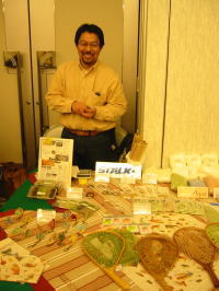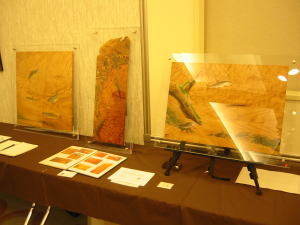 「水の記憶」の管理人 今尾栄仁さんのブース。 描かれているヤマメやイワナは 古代魚の趣です。 |