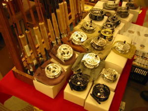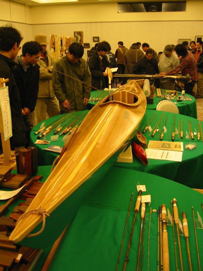 | 今回の展示品の中で一番目を引いたのがこれ。 ANGLER’S PITの木製シーカヤック!! バンブーロッドより簡単とは製作者の方の弁。 でもロッドは失敗しても魚が釣れないだけですが シーカヤックは沈むものなー。 ちなみに傷がつくと怖いので湖で2回しか 使用していないとのこと。 |