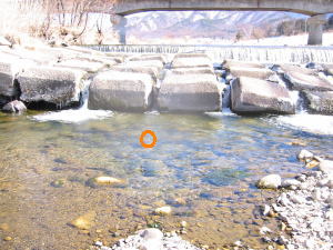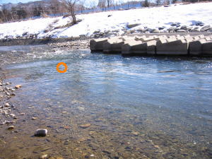 今シーズン第一号はイワナ。 シーズン初日で釣れたのは初めて。 上が釣れたポイント。 写真で見るよりは水深があります。 左は川上地区の千曲川。 雪はあまり多くなく、水量は少なめです。 |
