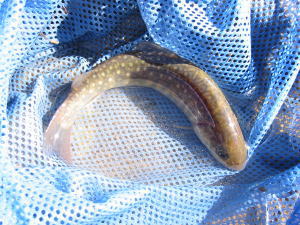 「型が小さい。魚がまだ動いてないね。今は餌はこれ(クロカワムシ)じゃないと釣れない。