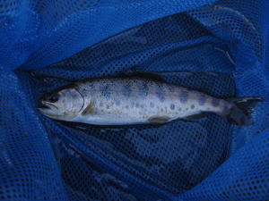 | G川の天然ヤマメ。 さびが出て、尾びれが引きちぎられたようにぼろぼろです。 冬を越すのはたいへんなようですね。 |