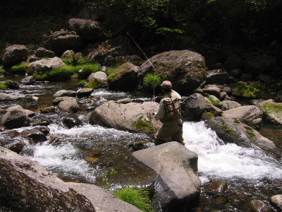 岩に腰掛けて待っていると一美さんが上って来ました。聞けば3匹ほど釣ったとのこと。うーん、早いなあ。